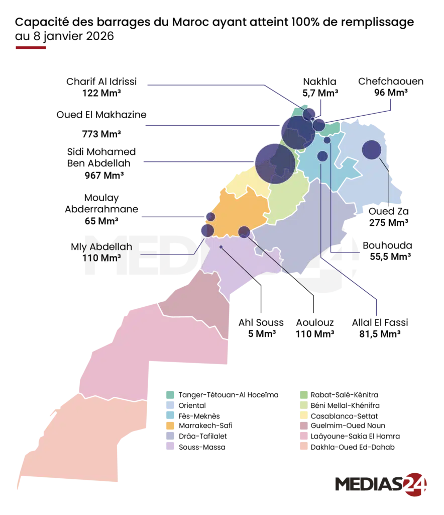 Cette amélioration de la situation hydrique s’est matérialisée par une hausse des stocks dans les barrages, dont le taux global de remplissage a dépassé 46%. Plusieurs barrages de capacité moyenne ont atteint 100 % de leur capacité, de même que deux grands barrages, à savoir le barrage d'Oued El Makhazine et le barrage de Sidi Mohammed Ben Abdellah, ce dernier affichant un taux de remplissage de 99,25 %.