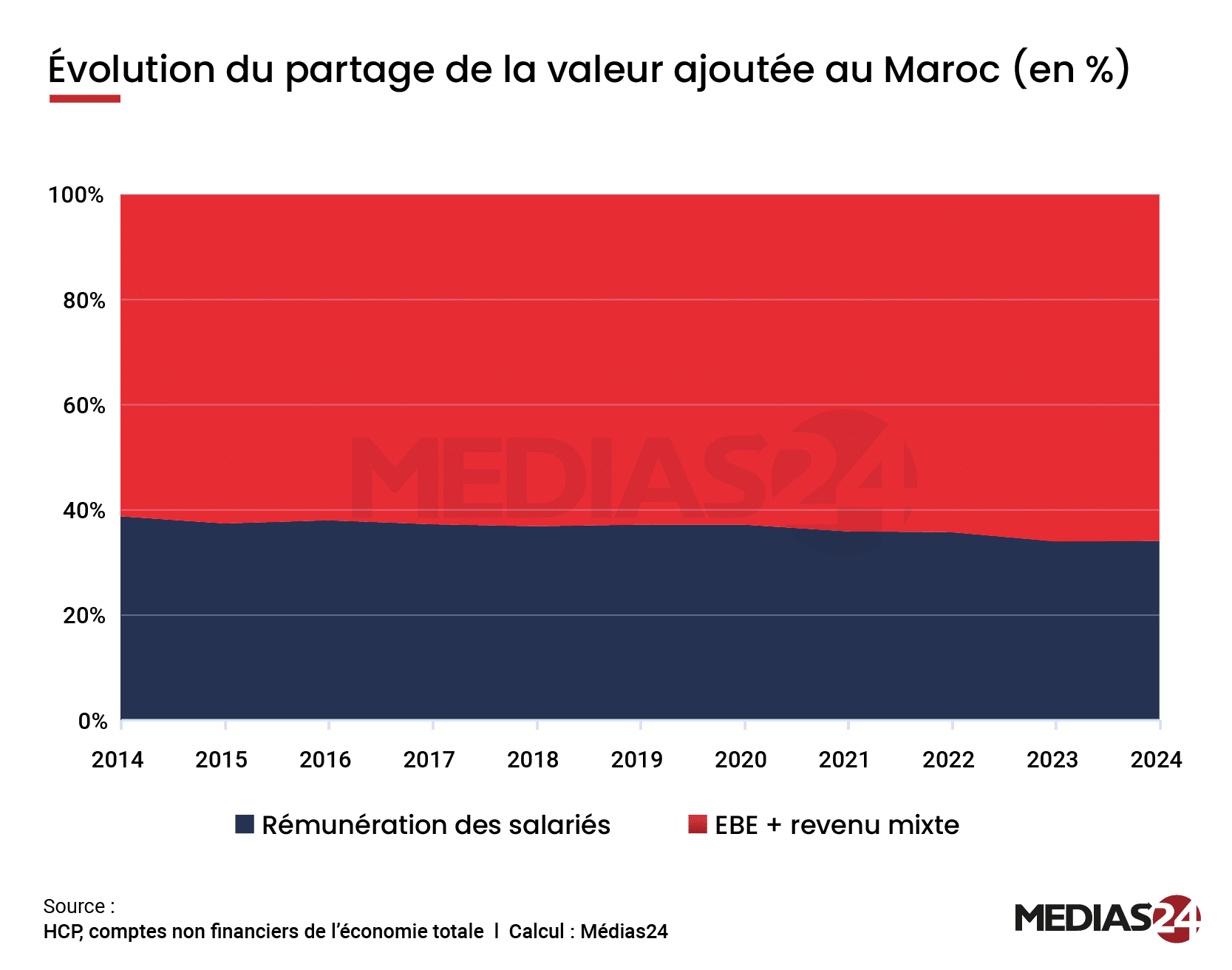 Pour apporter une réponse à ces questions, Médias24 analyse comment la valeur ajoutée créée chaque année se répartit entre salaires, excédent d’exploitation, revenu mixte et prélèvements.
