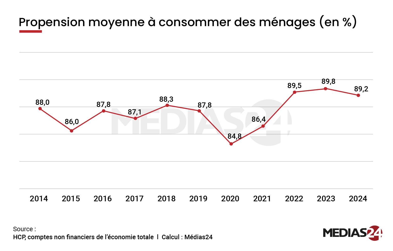 Un autre constat important concerne la propension marginale à consommer (PMC)*, qui mesure la part d’un revenu additionnel transformée en consommation. Sur la période 2014-2024, elle ressort à 91,6%. Autrement dit, chaque dirham supplémentaire de revenu disponible s’est traduit, en moyenne, par 0,92 dirham de consommation supplémentaire.