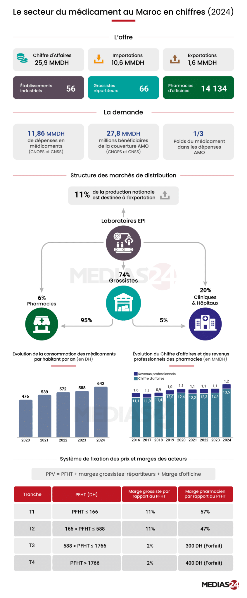 Dans le détail, le chiffre d'affaires global du secteur a atteint 25,9 MMDH en 2024, dont plus de 13 MMDH réalisés au niveau des pharmacies d’officine, qui constituent le principal point d’accès au médicament pour les patients.
