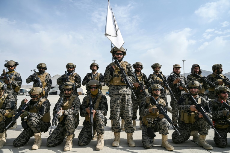 Les forces spéciales talibanes, appelées "Badri 313", chaussures et gilets beiges immaculés sur leur tenue de camouflage, posent pour des photos, lèvent des fusils américains et agitent le drapeau blanc de leur mouvement.