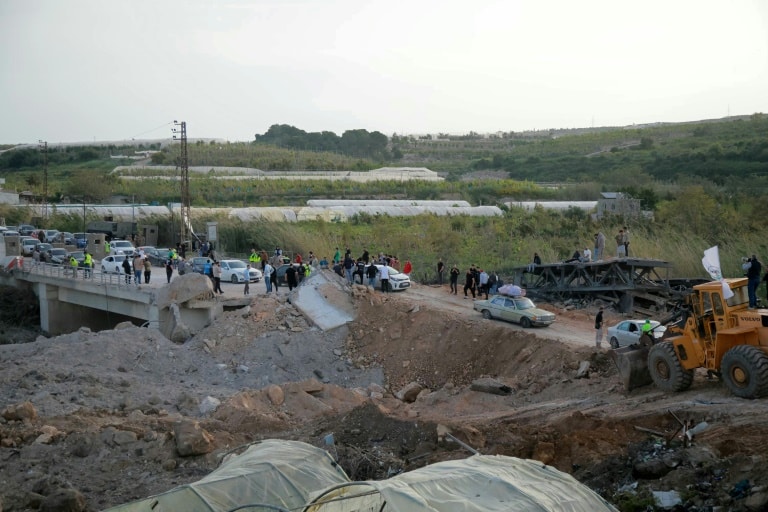 Quelques heures avant le cessez-le-feu, les bombardements israéliens ont endommagé le pont de Qasmiyeh et trois bulldozers oeuvrent, sous la supervision de l'armée libanaise, à boucher le cratère causé par les bombes.