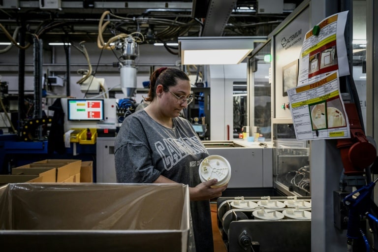 Dans l'usine Francia, au sud d'Oyonnax, les granulés de plastique circulent dans des tuyaux métalliques, comme un concert de bâtons de pluie, avant d'être liquéfiés puis moulés en spatules de boulangerie ou supports de cartes SIM.