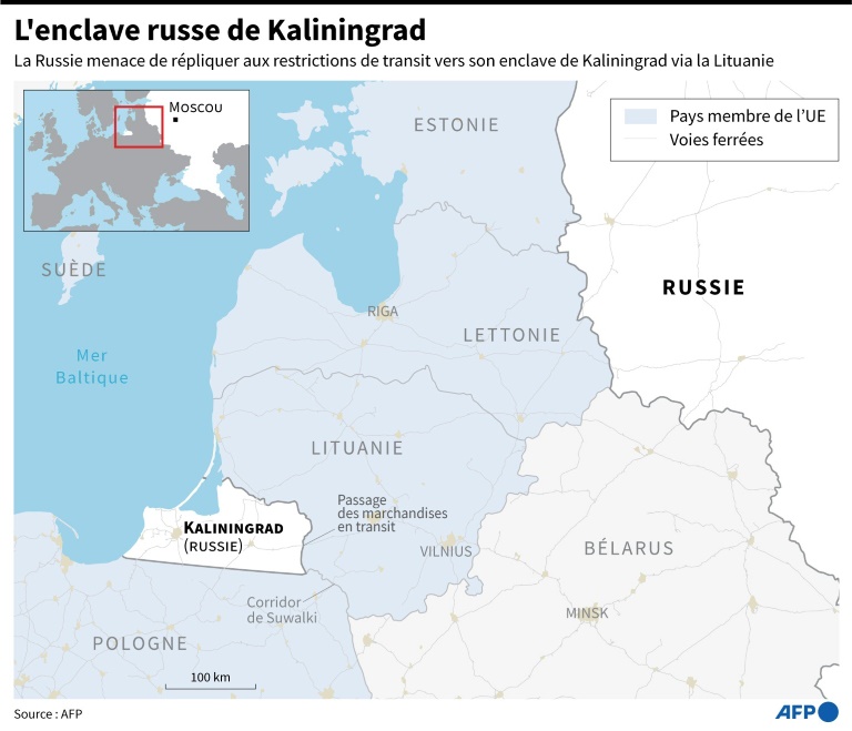 La Russie a menacé lundi de répliquer à l'introduction de restrictions "hostiles" sur le transit de certaines marchandises via la Lituanie vers son enclave de Kaliningrad, conséquence des sanctions européennes liées à l'offensive de Moscou en Ukraine.