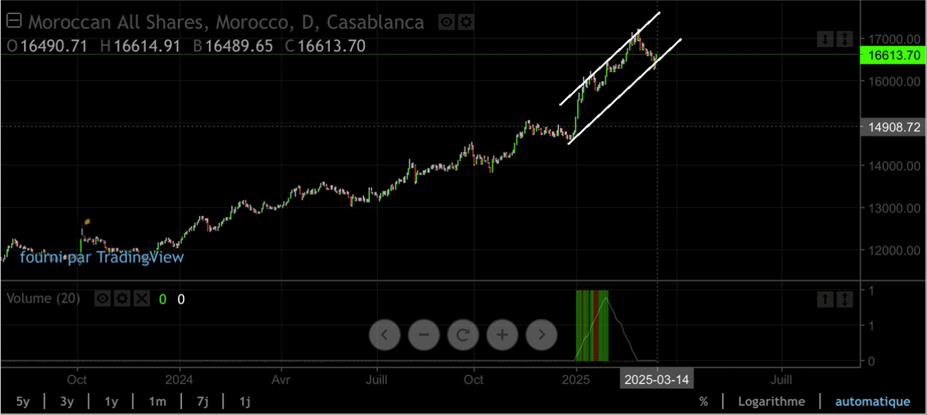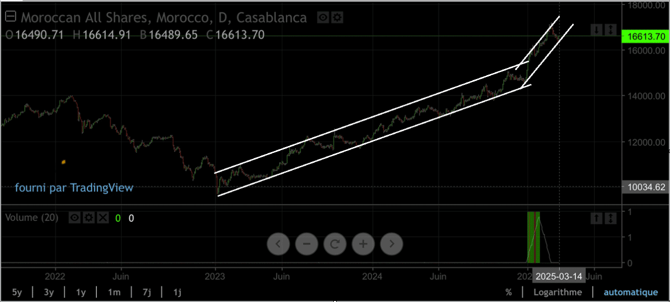 Côté graphique, le début de l’année 2025 a été marqué par une accélération de la tendance haussière (Cf. graphiques ci-dessous). Malgré la correction du mois de mars 2025, et tant que l’évolution du MASI ne sort pas du canal haussier tracé, la dynamique ascendante du MASI est intacte (évolution maintenue à la date d’aujourd’hui). Les jours et les mois à venir nous diront si la tendance sera maintenue !