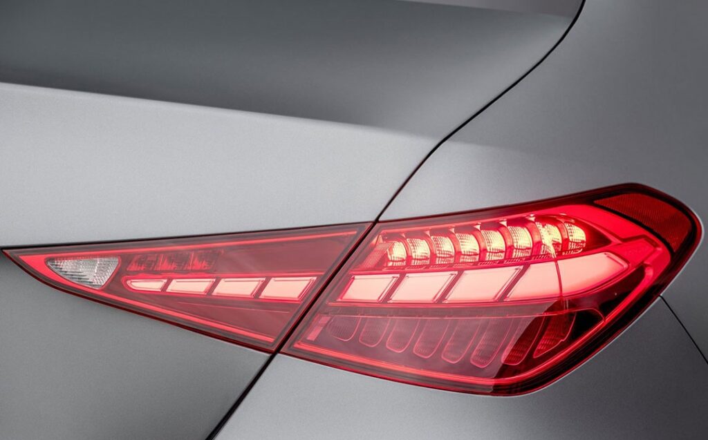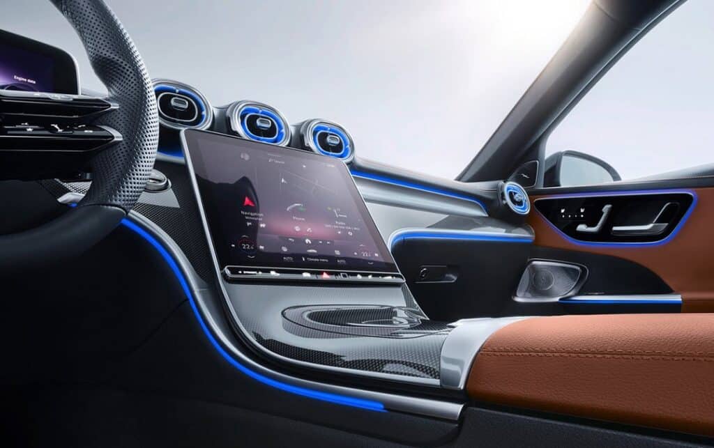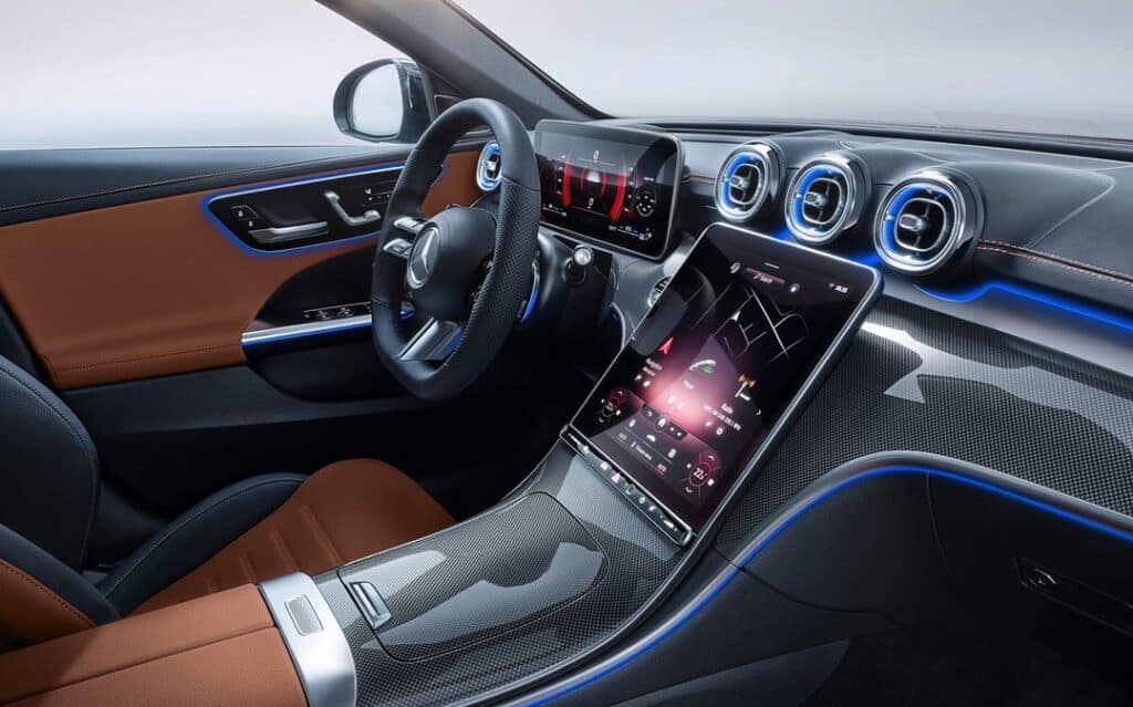 ABS, ESP, 6 Airbags, aide au démarrage en côte, contrôle de la pression des pneus, détecteur de somnolence, aide au maintien dans la voie, surveillance d’angle mort active, régulateur et limiteur de vitesse adaptatifs avec fonction freinage, frein de parking électrique, accès et démarrage sans clé, 4 lève-vitres électriques, rétroviseurs extérieurs électrochromes à réglage et escamotage électriques, rétroviseur intérieur électrochrome, climatisation automatique bizone, combiné d’instruments numérique 12,3’’, système d’infodivertissement à écran tactile 11,9’’ avec commande vocale, prises USB, Bluetooth, réplication de smartphone Apple CarPlay et Android Auto, recharge de smartphone sans fil, navigation GPS, allumage automatique des feux, détecteur de pluie, sièges avant sport chauffants à réglages électriques avec fonction mémoire, sellerie cuir, planche de bord habillée de cuir synthétique, volant sport AMG multifonctions gainé de cuir, pédalier Sport, sélecteur de modes de conduite, éclairage d’ambiance 64 couleurs 4 zones, aide au stationnement avec radar de distance avant/arrière et caméra à vision 360°, pack carrosserie AMG (calandre, boucliers et bas de caisse spécifiques), double sortie d’échappement décorative, vitrage arrière surteinté, toit ouvrant panoramique, ouverture de coffre motorisée, projecteurs Full LED, feux de jour à LEDs, jantes alliage AMG 19’’.