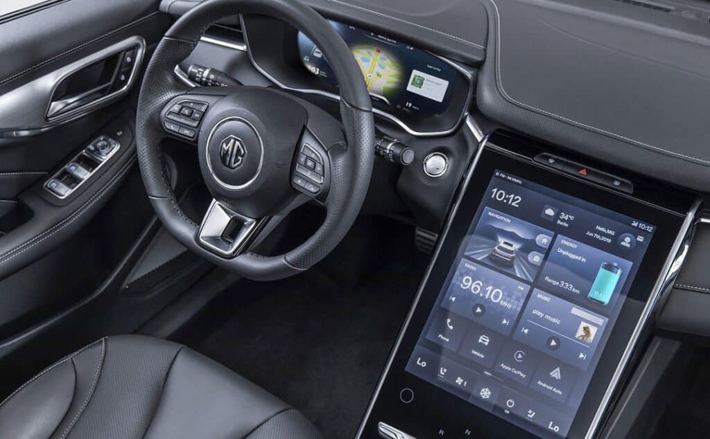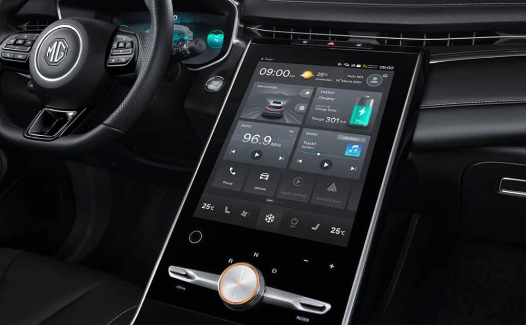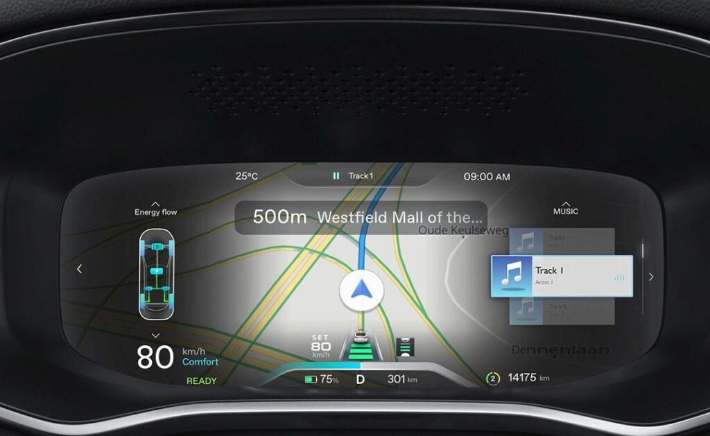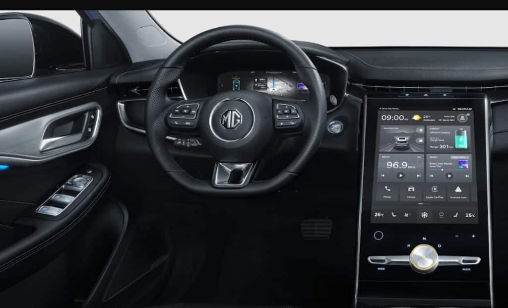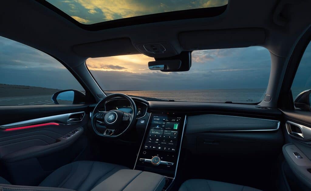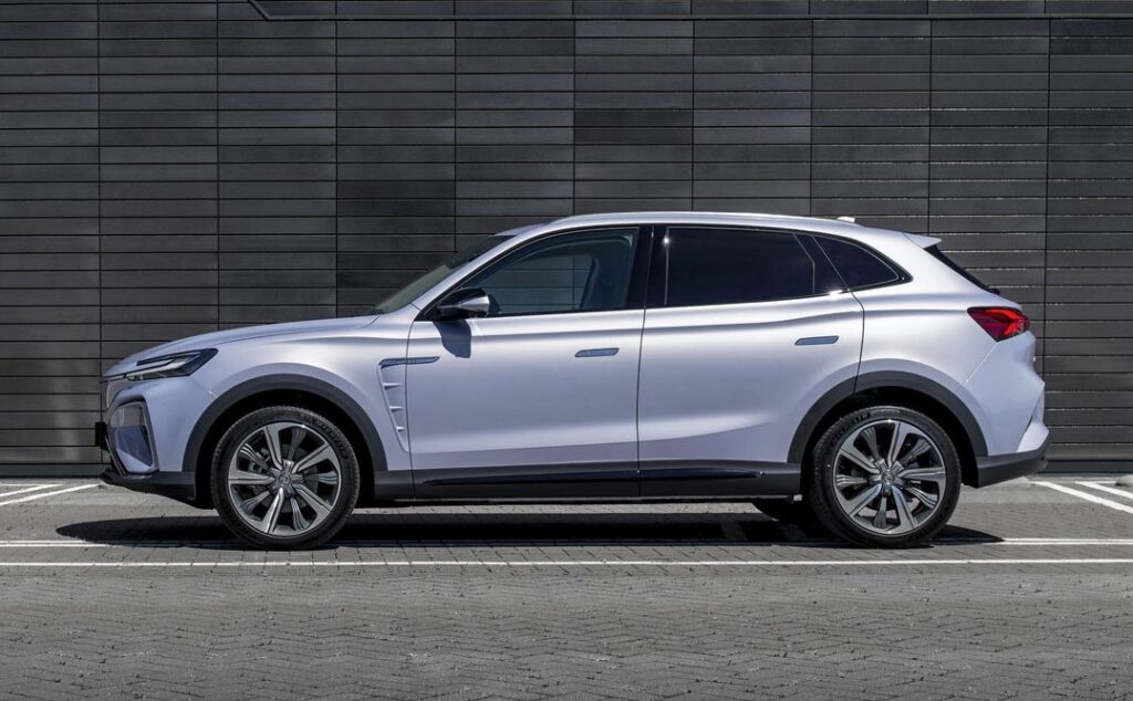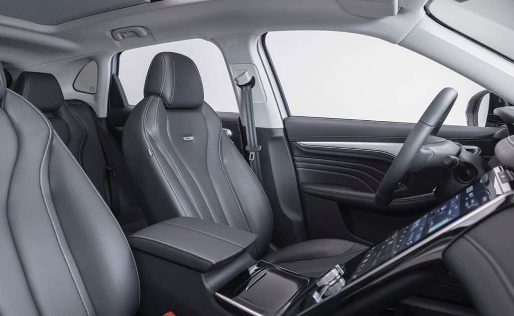 Sécurité 8 airbags : frontaux, latéraux et rideaux Système anti-blocage des roues (ABS) Répartiteur électronique de freinage (EBD) Système électronique de contrôle de stabilité (VSC) Système d'assistance au freinage en courbe (CBC) Assistance au freinage d'urgence (EBA) Gestion intelligente des feux de route (IHC) Système d'aide au respect de la vitesse (SAS) Avertissement de collision frontale (FCW) Freinage préventif multi-collisions (MCB) Assistant à la conduite dans les embouteillages (TJA) Reconnaissance des panneaux de signalisation (TSR) Aide au maintien dans la voie (LKA) Avertissement de changement de voie (LDW) Maintien d'urgence dans la voie (ELK) Surveillance des angles morts (BSD) Avertissement de trafic à l'arrière du véhicule (RTA) Avertisseur d'ouverture de portière (DOW) Avertisseur de somnolence (DWS) Frein de parking électrique avec AutoHold Indicateur de perte de pression des pneus Système de fixation ISOFIX Immobilisateur anti-vol Confort Climatisation automatique Bi-zone Régulateur de vitesse adaptatif (ACC) Capteur de pluie Accès et démarrage sans clé Banquette arrière rabattable 40:60 Sièges avant chauffants & ventilés Sièges arrière avec accoudoir central et porte-gobelets Siège conducteur réglable électriquement dans 6 directions avec fonction mémoire Siège passager avant réglable électriquement dans 4 directions Rétroviseurs extérieurs électriques chauffants à rabattement automatique Rétroviseurs extérieurs chauffants Rétroviseurs extérieurs à mémoire Rétroviseur intérieur photochromatique Coffre électrique Caméra à 360° Aide au stationnement avant & arrière Esthétique Jantes aluminium 19" Sellerie CUIR Volant cuir Pédalier aluminium Toit ouvrant panoramique Feux de jour et phares avant à LED Phares antibrouillard arrière à LED Poignées de porte affleurantes Poignées de porte chromées Vitres arrière surteintées Barres de toit Eclairage d'ambiance Connectivité & Multimédia Compteur numérique 12,3" Console centrale flottante 19,4" avec écran tactile 14" Compatibilité avec les systèmes Android Auto & Apple CarPlay Suppléments et options Garantie : 6 ans ou 200.000 km Batterie : 8 ans ou 200.000 km