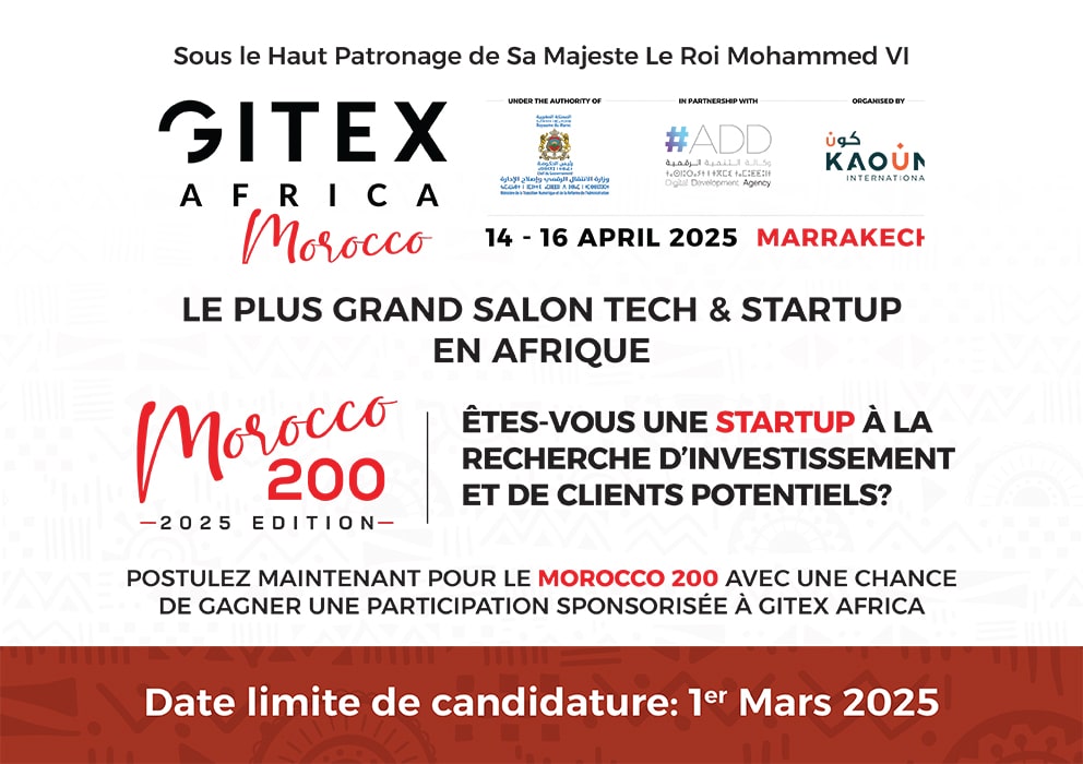 Dans l’optique de favoriser l’internationalisation des startups marocaines et de dynamiser leur présence sur la scène technologique mondiale, le Ministère de la Transition Numérique et de la Réforme de l’Administration, en collaboration avec l’agence de développement du digital (ADD), a lancé l'initiative "Gitex Africa Morocco 200".